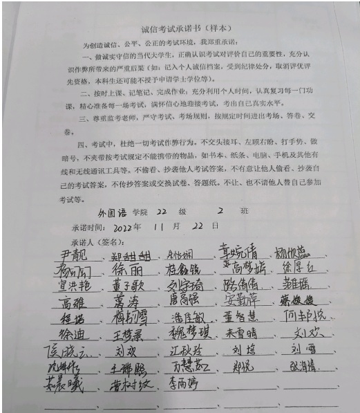 强化思想政治教育:各年级、各班级辅导员带领学生认真学习《普通高等学校学生管理规定》、《太阳成集团tyc539学生违纪处分办法》,告诫同学们违规违纪的相应处理规定,消除了同学们的侥幸心理,提高了他们的责任意识。同时,各班级召开“考试诚信教育”主题班会,签订考试诚信承诺书,大力弘扬“诚信考试光荣、作弊违纪可耻”的学习风尚。