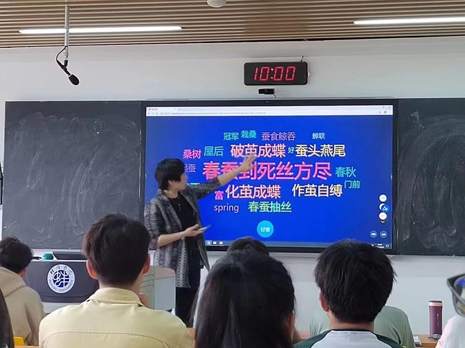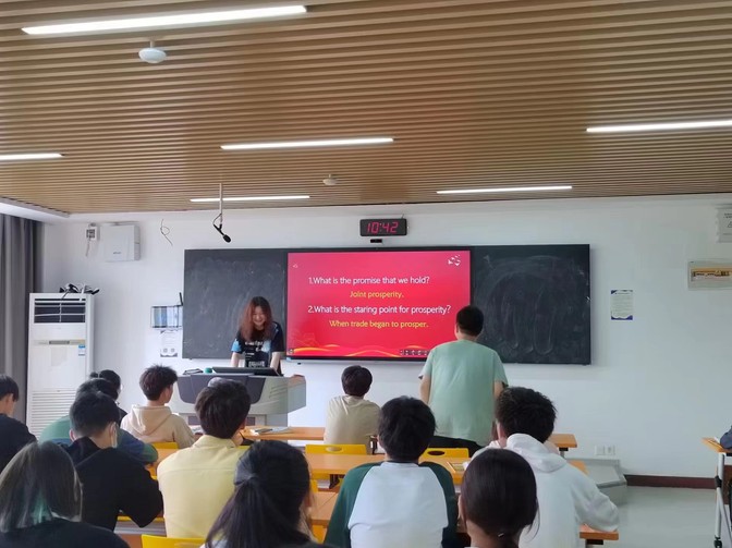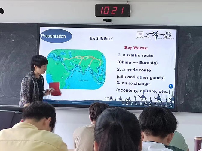 党员教师吴沛瑾主讲了本次示范课。她以第五单元课后文化翻译篇章The Belt and Road 为主题,课程开始以“蚕”的相关成语和经典诗句为导入问题,成语、诗句翻译方法学习为切入点,引出The Silk Road 以及The Belt and Road 的主题,结合学生的主题汇报展示,引导学生深入了解中国古代丝绸之路的辉煌以及现代“一带一路”倡议取得的伟大成就。吴沛瑾以翻译教学的手段和功效,培养了学生们的文化自信,结合习近平总书记在博鳌亚洲论坛2021年年会开幕式上发表的主旨演讲,帮助学生掌握一带一路热词,取得了很好的教学效果。