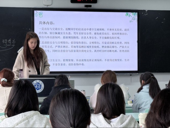 结合清明祭扫传统,班会大力倡导绿色文明祭扫,着重普及森林防火与居家消防安全知识,严禁违规用火,严防火灾隐患,守护自身与公共安全。针对假期饮食、外出游玩等场景,也提醒同学们注意饮食卫生,做好个人防护,远离危险区域,防范各类安全风险。